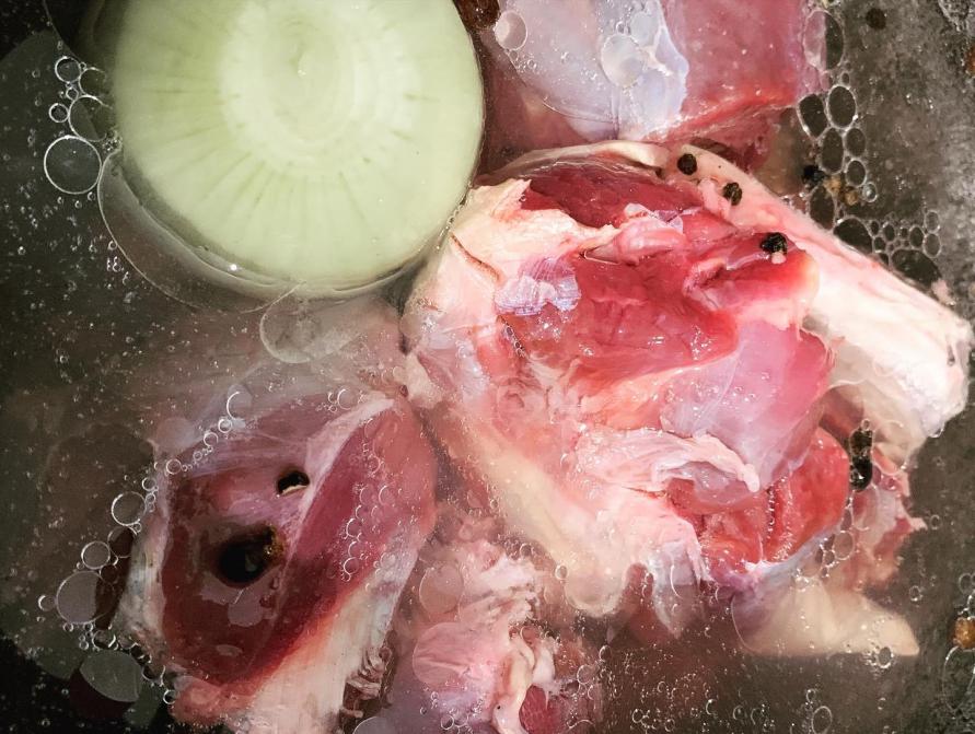 Воду доводим до кипения. Кладем мясо в кипящую воду. Уменьшаем огонь и оставляем на 20-30 минут, пока не появится шум (пена на поверхности).