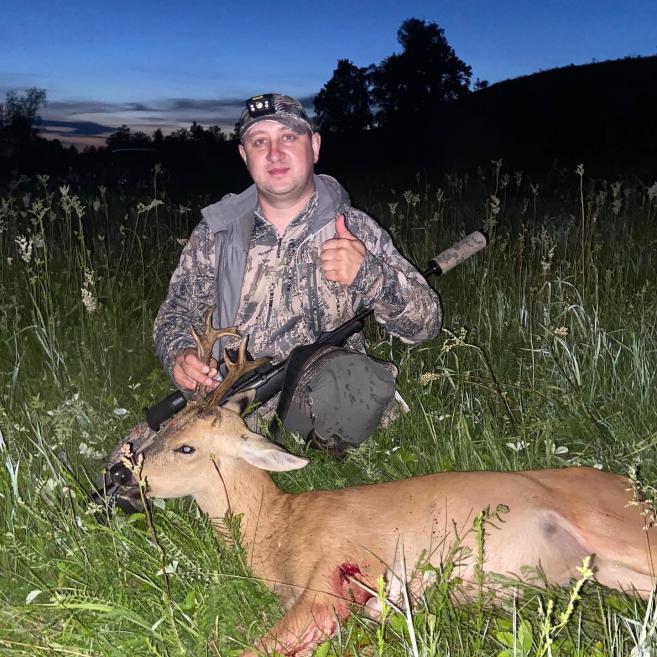 Открылись на козла на гону. Классика - манок Бутталло, вышел последним из леса в овраг, 156 метров. Пуля ППУ Гром 11,0гр.
