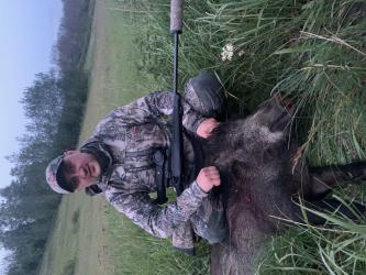 Летний вечер кружил голову богатым ароматов трав, легкий ветерок колыхал колосья пшеницы. Мы ждали выход кабана ( Аха-ха , вот я Пушкин!) . Рассказываю по человечески: Выехали с парнями поискать, покараулит пятачков. По информации разведчиков, кабанчики в основном в подсолнухе, но пара гурманов любят именно пшеничку! . По светлому проверили местоность, нашли тропки, нашли (жвачку), выбрали место и остались ждать. Первые тричаса ничего не дали, только лисенок пришел полюбопытничать, заяц в наглую перешел дорогу и козел пасся от нас метрах в 300-стах. . В 00.40 козел забеспокоился, почуствовав приближение другого зверя, заволновался и начал сдвигаться в глубь поля... Вышел ОН! Тот кого я очень ждал! . Дав кабанчику спокойно зайти на поле, оглядеться и почуствовать себя в безопасности, подождав, пока он начнет спокойно ужинать и перестанет озираться, начали подходить. . Он зашел на 100 метров в пшеницу и спокойно жевал свою любимую жвачку, кода я уже разглядывал его с краешка дороги. Разглядев зверя довльно таки тщательно, растянув момент удовольствия от созерцания зверя в дикой природе, от возможности прикоснуться к тому, что часто скрыто от большинства глаз, успокоив дыхание от подскочившего адреналина, мне пришлось нарушить ту тонкую грань, которая разделяет два, таких желанных для охотника состояния: предвкушение и ликование!!! . ВЫСТРЕЛ!!! . Ни звуков, ни картинки в прицеле, тишина и поле... Тихое, ночное поле, только стук собственного сердца... . Включены налобники, оружие на готове, аккурутно двигаемся к месту "жировки". Нам сюрпризы не нужны! Лежит наш красавчик! Никаких движений, выстрел четко по позвонку, лег на месте сразу! Традиционное "С полем!" и дружеское пожатие рук. . Дальше все по классике и прозаичнее: веревка на пятак и тащим на край поля, разделка, упаковка и домой! Насторение -огонь, сезон по копыту открыт, ждем 20 августа и открытия козиков на реву . Ничто так не греет душу охотника, как удачно завершившийся выход на охоту, тем более -кабанчик желанен большинству из нашего братства, а уж летний двухлеточка -вкусный аки мамкины пирожки, вдвойне!!!