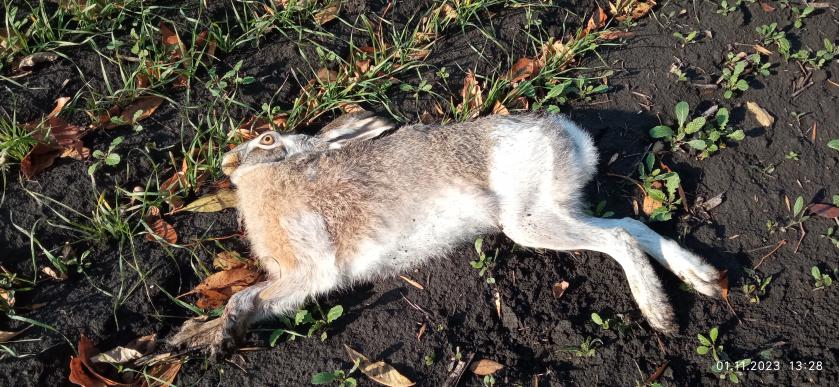 Осеннюю охоту люблю, потому что понимаю, где искать в это время года зайца. Главное- хорошо изучить охотугодья, где охотишься. Где зимой видел зайца, там и осенью он будет. Каждый год, у меня, это подтверждается. Первого зайца добыл 29.09.23. Участок местности имел много небольших и не глубоких ям: как будто после бомбежки, с травой и травяными кустами. В одной он и лежал под таким кустом. Выскочил метрах в 10 и прикрываясь за травой понесся вперед, но потом резко уменьшил пыл. и побежал медленнее, подпрыгивая, как косуля Стрелял в угон "3" БК. Попал первым в голову.Вес 3700.