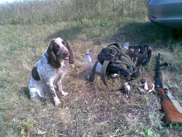 С 02.09.11г. по 03.09.11г. выбрались с Тимкой на наше любимое болото. О\Х Лебяжинское - это раздолье для спаниеля. К сожаленью в этот сезон запретили перепела почемуто, пришлось только слушать его бой. Но мы охотники порядочные, нельзя так нельзя. Утку мы игнорируем в силу ряда причин, по этому пошли за бекасами, благо их блеяние раздаётся на всю округу. Был забавный момент. Тимон челночил окраину болотины, я наслаждаясь ранним утром (5.00) плёлся сзади. И тут мой верный друг, с важным видом забежал мне за спину и начал что-то не довольно фырчать и петлять. Грешным делом, я высказал в адрес Тимона, что он мышколов и уже собирался вернуть его на путь истинный, но... В двух шагах за моей спиной, как перегруженный ПО-2, свесив лапки поднялся коростель. Предвкушая скорый, такой драгоценный трофей быстро дуплечу в белый свет как в копеечку и наблюдаю дальнейший полет так желанной дичи. Тимон повернулся ко мне и такое высказал в мой адрес, что до сих пор перед ним стыдно! Ещё видели дикую козу, которая встала в камышах в шагах пяти и уставилась на нас. Тимка был занят более важными делами, по этому козу сразу не заприметил. А когда я обратился к нему, коза вскочила и отбежала метров на 20 и засела в кустах. Песик с интересом начал изучать новый запах на месте лёжки. Взял Тимку на поводок ушёл с этого места, дабы не тревожить животное, но впечатления классные. На обратном пути к машине, на скошенном поле собрал шампиньоны. Итог два бекаса, маленький рюкзачок грибов и море впечатлений! Дома правда с Тимки снял 38 клещей, но все дохлые (Вот паразиты!)
