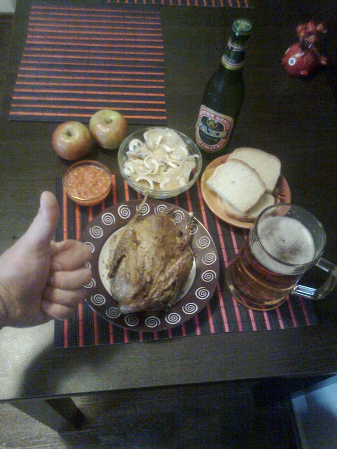 А вот и гусик фаршированный гречкой и собственными потрашками. Только забыл крылышки в фольгу замотать