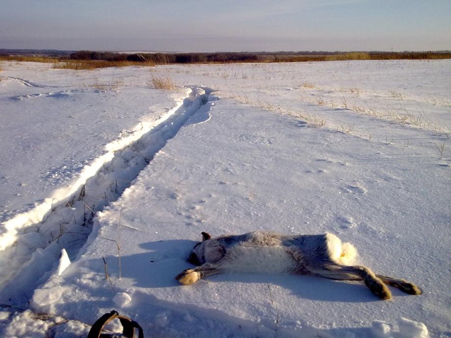 Сегодня сходили на охоту. Взял двух косых в одной посадке! Первый подпустил метров на семь к лежке, но потом его нервы не выдердали и он был взят, а второй поднялся метров за восемьдесят, пробежал метров четыреста и опять в посадку.Пока я разбирался с его следами, товарищь ,шедший по другой стороне посадки, вырвался вперед и видимо напугал сидевшего там зайца, и через несколько минут, я увидел бегущего мне на встречу косого. Я замер и он добежал прям до меня, где тоже был успешно добыт! 2:0 в нашу. фото с двумя позже.
