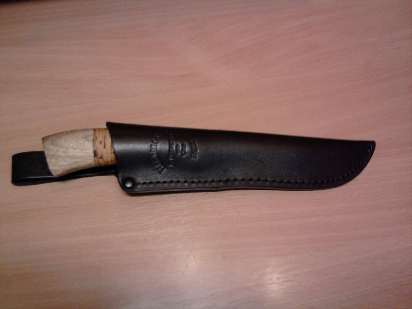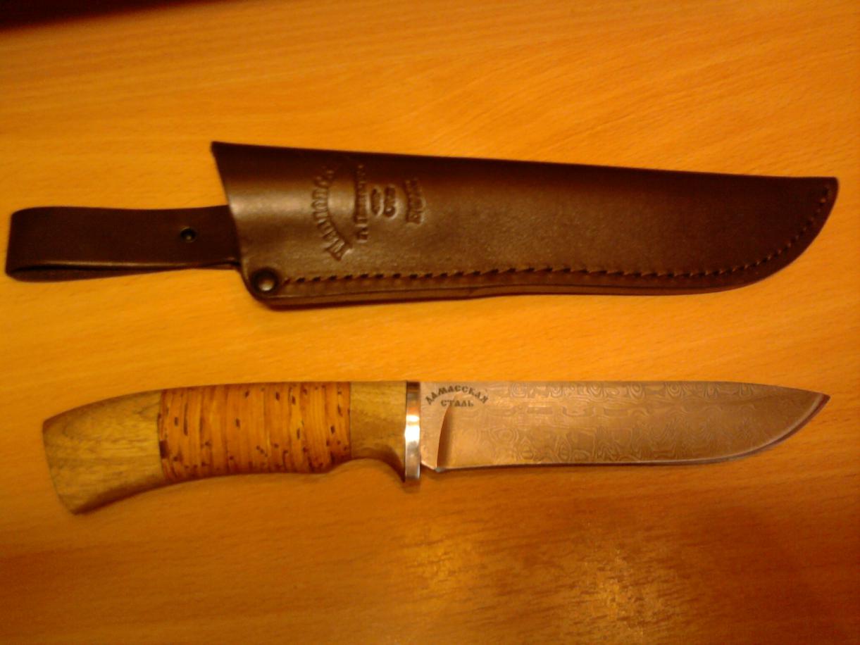 А я вот такой прикупил на выставке. Павловские ножи, дамасская сталь, цена 1 800, по моему очень даже не дорого. Из булатной стали - там же по 2 00 всего. А из нержавеющего дамаска по 5 000 уже (разница с обычным в количестве "узоров", говорит в обычном дамаске 1 200, а в нержавеющем 2 000). Толщина обуха всего 2.2 мм.