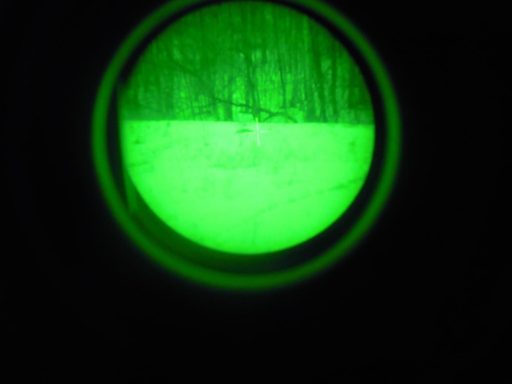 Так выглядит лесопосадка и добытый кабан в ПНВ третьего поколения! До лесопосадки около 80 метров! Ночь без звезд и луны, лесная поляна! Сорри за качество, лучше не вышло!