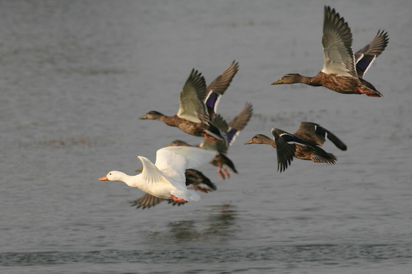 Я думаю так, утки домашние вполне могли уйти далеко от дома по речке, или хищник угнал.