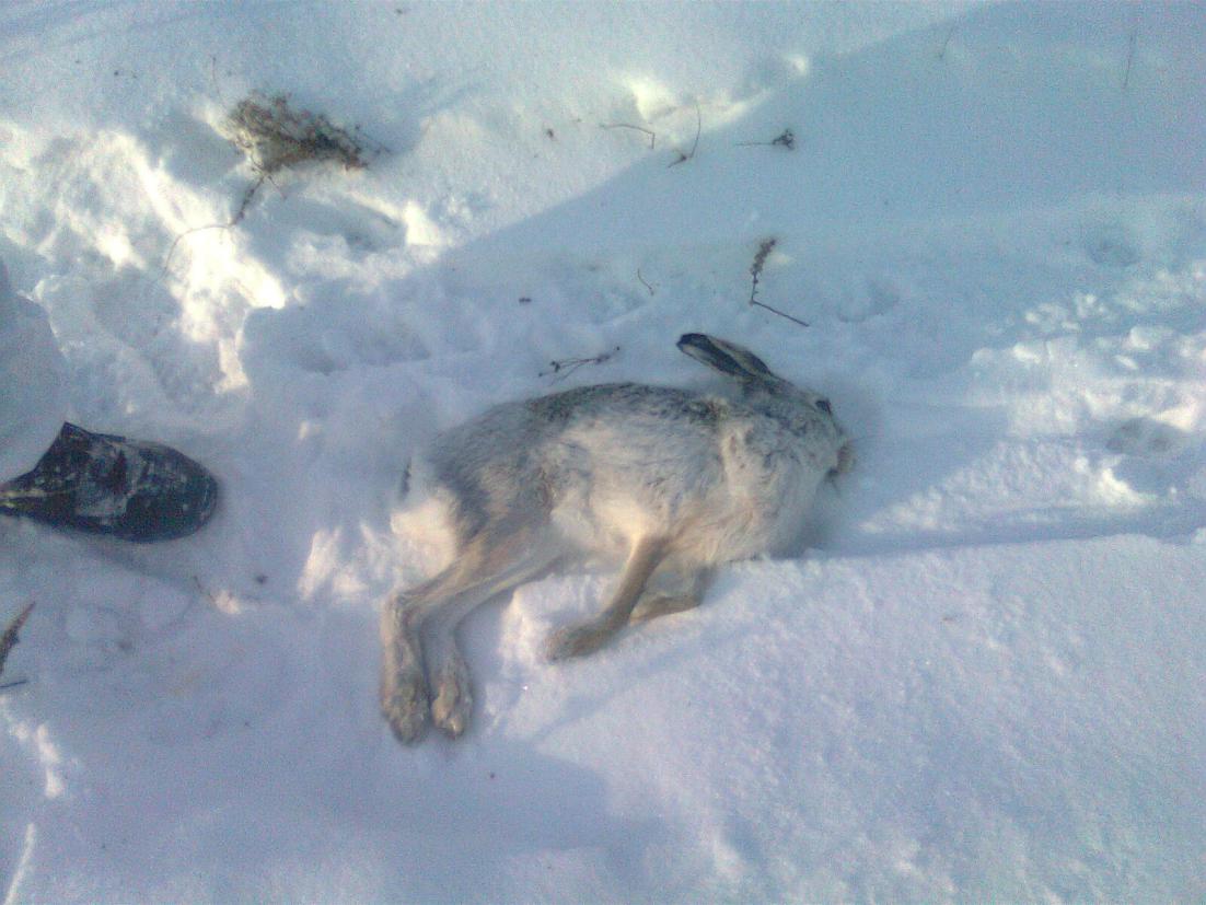 Вот и мы седня проредили популяцию косых, я мой отец и Серега 269 (ну еще наша собака, которая стерла подушечку на лапе ) прогулялись седня на славу, заяц лежал в траве, что с мой рост. Сначала я начал тропить один след, вдруг сошлись два следа, но но потом на следе снегохода они разошлись в разные стороны я как правильный пошел на право пройдя с полкилометра тут след уходит вправо, я по следу метров десять и смотрю поднялся, а в траве то снега полно, бежит медленно вообщем с третьего я его взял. Фото не ахти ( какие уж есть).