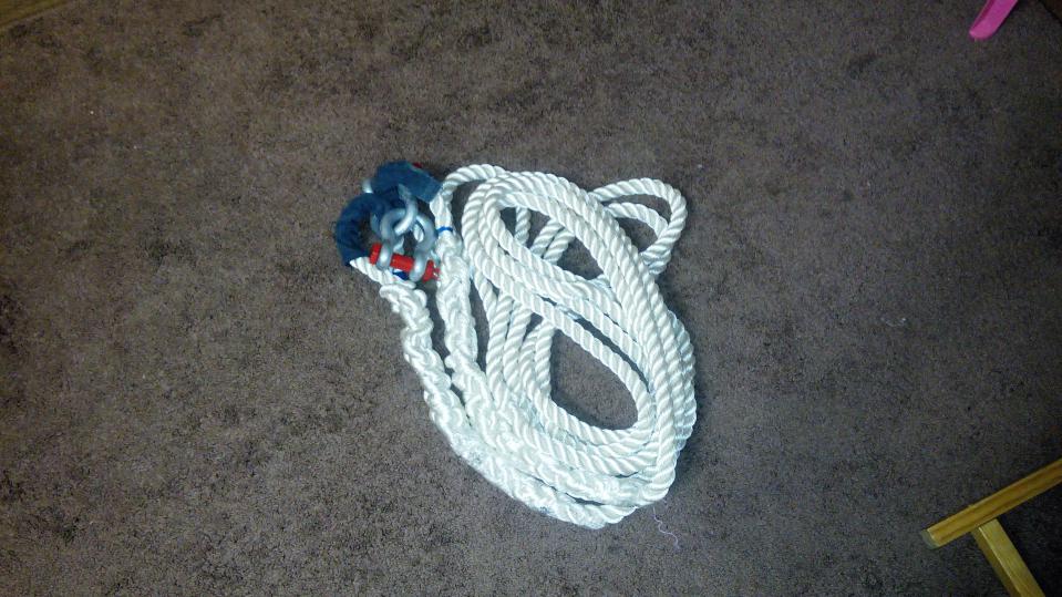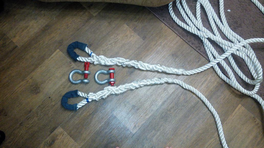 Приобрел я себе полиамид 22мм и пару шаклов тоже 22мм (4,75 т). Каната брал 11 метров, на заплет ушло по 2*70 см + петли в итоге рабочих осталось 9,5 грубо метров