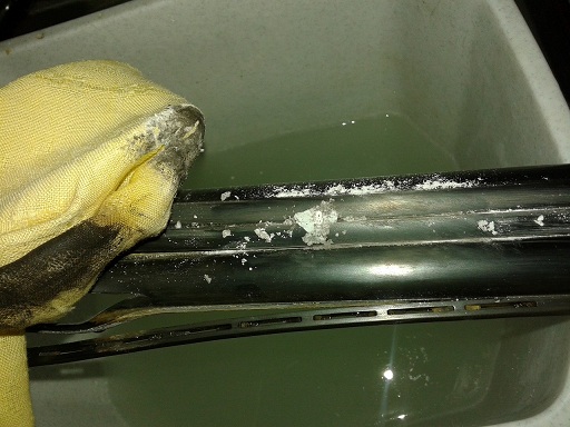 И так! налил я в ведро горячей воды из под крана, для страху решил сыпануть туда пемолюкса. постояло минут 10. взял крутой кипяток и полил на ствол, протер тряпочкой.она только чуть испачкалась.