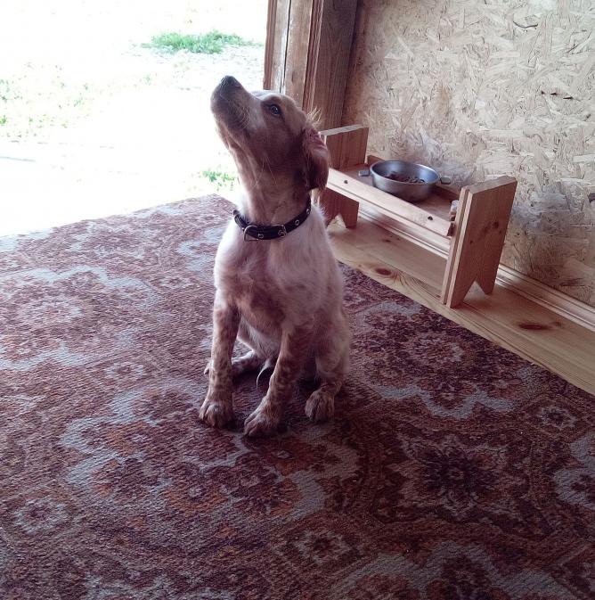Сука тоже хорошо,но мы с женой изначально хотели взять бело-рыжего кобелька. Ему сейчас только 3.5 мес, но уже стойки на крылышки делает.