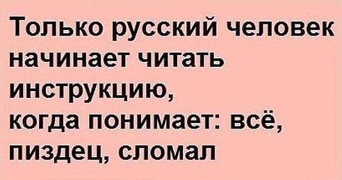 М16 – Клинит, когда грязная AK47 – Работает, когда грязный Трехлинейка – Не была чистой с момента выдачи в войска в 1892-м М16 – Сотни движущихся деталей, скрепленных десятками болтов и винтов AK47 – Пара десятков движущихся деталей, удерживаемых пригоршней заклепок. Трехлинейка – три движущихся детали, два винта. М16 – Вы скорее умрете, чем решитесь поломать свою дорогущую винтовку в рукопашной АК47 – Вашим автоматом можно неплохо отбиваться в рукопашной Трехлинейка – Ваша винтовка – это классное копье с возможностью пострелять М16 – Если сломается боек, вы отправляете винтовку на завод по гарантии АК47 – Если ломается боек, вы вставляете новый Трехлинейка – Если ломается боек, вы закручиваете его на пару оборотов дальше в затвор М16 – Сложнее в производстве, чем многие самолеты АК47 – Используется странами, у которых нет денег на самолеты Трехлинейка – Из нее сбивали самолеты М16 – Под лупой плавится пластиковый приклад АК47 – Под лупой можно рассмотреть до сих пор работающую вместо смазки вьетнамскую грязь Трехлинейка – Под лупой можно увидеть пропитавшую дерево КРОВИЩУ Любимый напиток владельца М16 – Коньяк АК47 – Водка Трехлинейка – Тормозная жидкость, слитая по замерзшему лому М16 – Делает маленькую дырочку, все аккуратно, в соответствии с Женевской конвенцией АК47 – Делает большую дыру, иногда отрывает конечности, не соответствует Женевской конвенции Трехлинейка – Одна из причин для создания Женевской конвенции М16 – Отлично отстреливает мелких грызунов АК47 – Отлично отстреливает врагов Трехлинейка – Отлично отстреливает легкую технику М16 – Попав в реку, перестает работать АК47 – Попав в реку, все равно стреляет Трехлинейка – Попав в реку, обычно используется как весло М16 – Оружие для обороны АК47 – Оружие для нападения Трехлинейка – Оружие Победы! М16 – Подствольник тяжел, но может положить гранату в окно за 200 метров АК47 – Если что, гранату от подствольника можно забросить в окно рукой Трехлинейка – Гранату в окно? Бей через стену, патрон пробивает почти метр кирпича М16 – Можно поставить глушитель, небольшой патрон не дает много звука АК47 – В принципе, можно поставить глушитель, но лучше просто прижимать врагов к земле непрерывным огнем Трехлинейка – Нафиг глушитель, когда после первого выстрела все по-любому оглохнут |