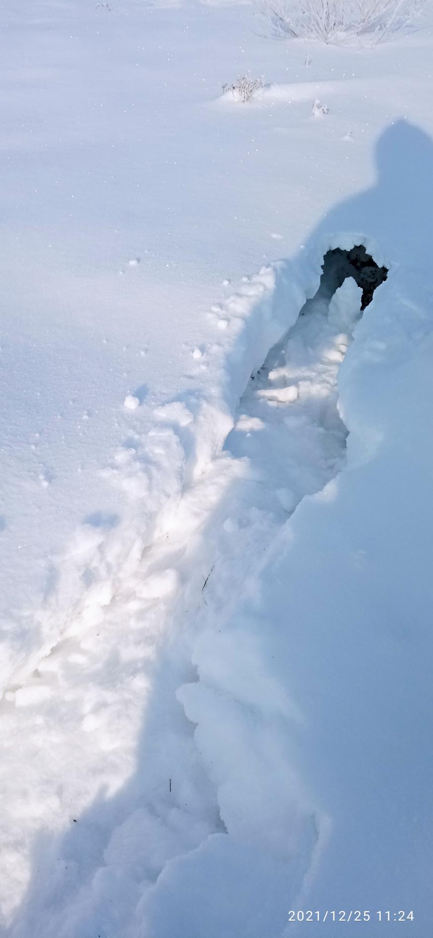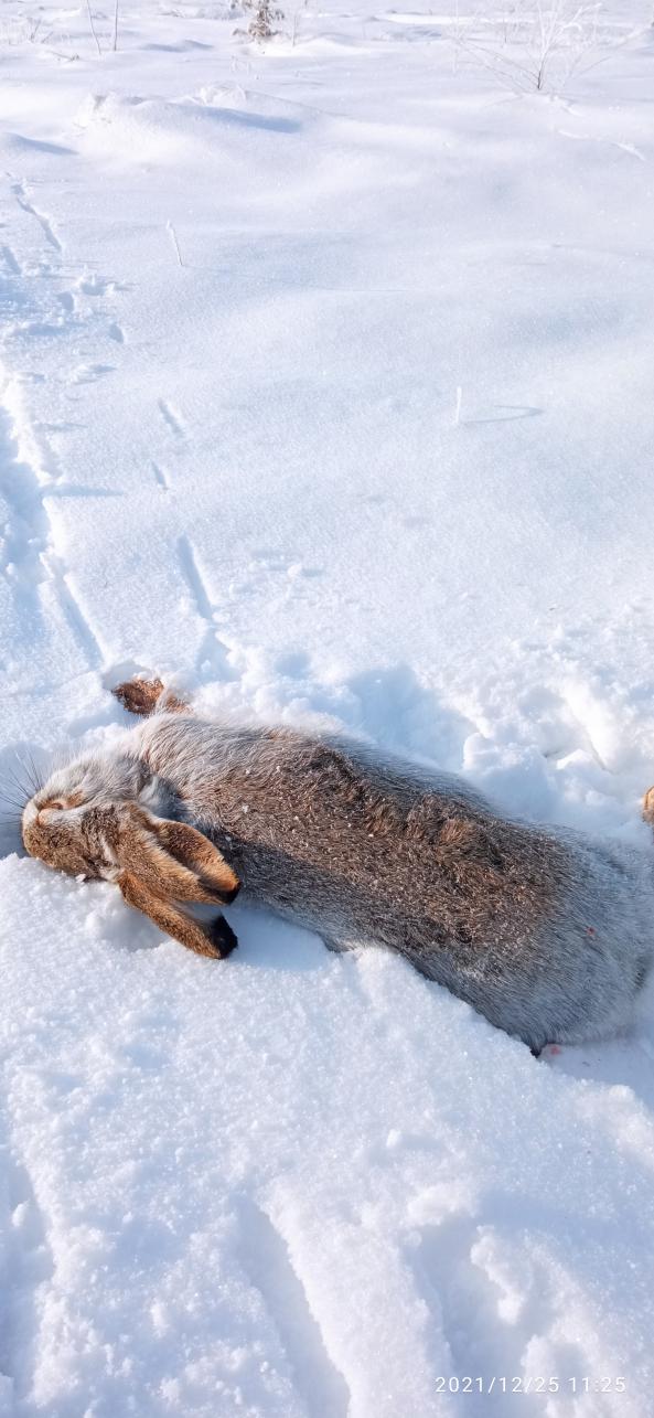 25.12.21г. – в Красноармейском районе сильный ветер. След от лыж заметает за минуты. Нашел свежий след зайца, который скинулся в траву, а потом в посадку. Посадку пересек и … след пропал. Кое-как его нашел в виде занесенных теней на снегу. Пошел в направлении, которое указали эти тени. Следа не видел, но отходил от общего направления, то влево, то вправо, осматривая вероятные места лежек. Так дошел до посадки, где увидел не занесенные следы. Попробовал опять тропить, но след, выйдя на ветреную сторону посадки, опять пропал. Внутри посадки след опять увидел. По направлению понял, что заяц пошел обратно в направлении первой посадки, Следов не было и я пошел через поле к посадке. Не доходя посадки, возле старой свалки с земляными холмиками и бетонными блока опять увидел следы. Когда заяц меня увидел и сорвался с лежки- не знаю. Но когда я нашел его выходной с этого места на чистое поле- след был уже подметен. А заяц залетел в посадку в том месте, откуда вышел из нее и пошел вправо внутри нее. Через 20м вышел наружу и побежал вдоль посадки. Я его пытался перехватить на "обратке", т.е. уходил на 200 м от посадки, шел метров 300м, а потом возвращался к посадке. Но заяц все уходил и уходил. Таким образом он ушел на 2км. Через 2км я окончательно потерял его след и надежду его найти. Начиналась сильная поземка и смысла охотиться дальше не было.