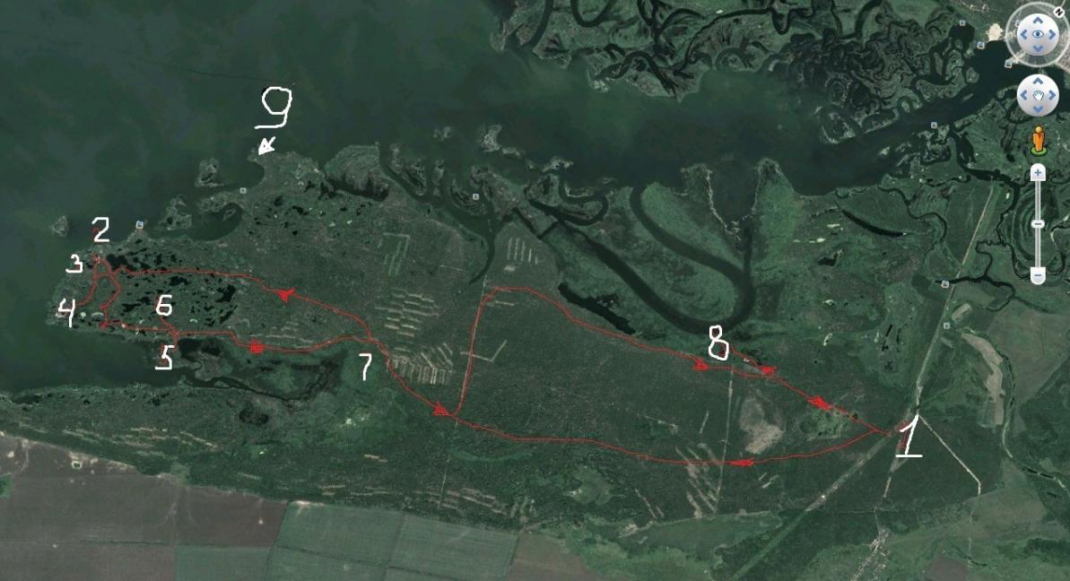 1-лесничество, 7-лисья гора, 2-где ты на море по камышу ходил, 3-селезней стрелял, 4-база, 5-где мы на открытии были, 6-чирков поднял, 7-снова развилка, 8-вечерку стояли. 9-рыбацкий стан, куда ты выехал)))