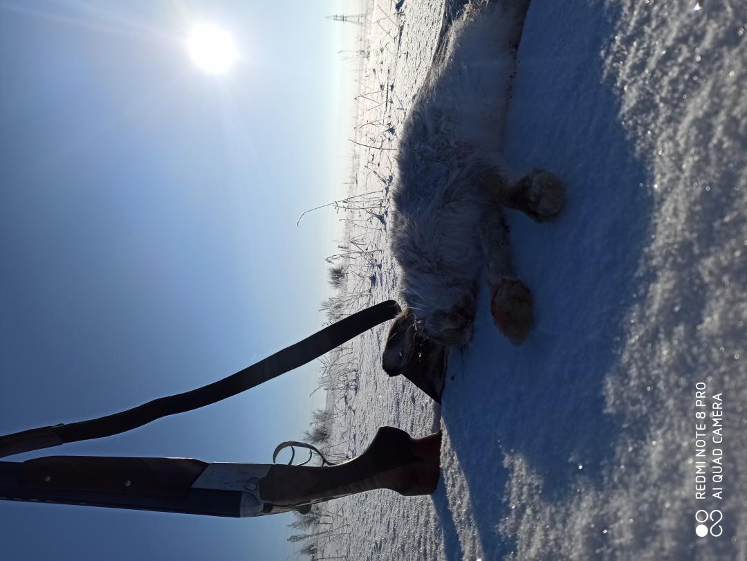 В общем, пройдя десяточку, размялся, поплевался и поехал в соседнее хозяйство, забирать более сговорчивых тупорылых, " чужих " зайцев, НО! И там все искатано техникой , снежиками и квадроциклами, чем и воспользовались ушастые ночью... фиг разберёшься куда пошёл и где скинулся.. Однако по дороге домой увидел таки вожделенный чёткий след, пройдя ещё трешку, увидел в колке сдвойку, обхитрил ушана и одним выстрелом( очень сложным, в кустах) решил исход сегодняшней непростой охоты))- выехал в 11, в городе был в 17.