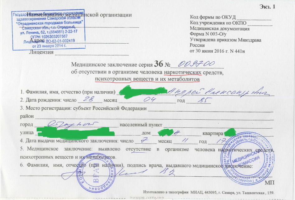 НО! В мед.центре дали три справки (Общая, нарк и псих) А нужно 4! + от нарколога о том, что не стоишь на учете. Пришлось вернуться за 4 справкой в мед.центр. Выписали без проблем и сказали, что раньше трех достаточно было, а с августа я уже третий, кто приезжает к ним за четвертой. Имейте ввиду! |