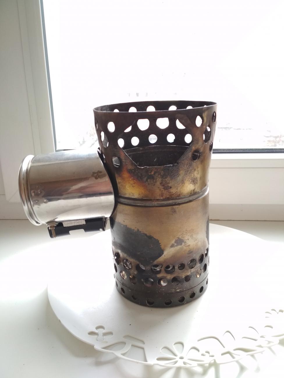 Выше по списку грелка-термос, а это горелка-термос)). Горит неплохо при более- менее сухих щепках, ну и лучше, когда есть ветерок. А если к ней приколхозить карлсона от PS-600T, то будет практически идеальный вариант. Карлсон как раз резервный в наличии. Только конкретно к этой печке не очень подойдет. Изначально насверлено слишком много отверстий. Теперь не заваривать же их. Через отверстия со стороны крепления карлсона блок питания вентилятора может подгореть. Но ведь у кого-то из вас наверняка есть нерабочий термос