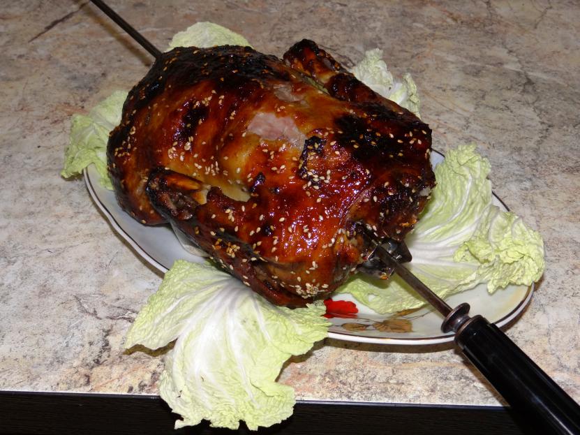 Два часа в духовке, чередуя вертел и турбо гриль.