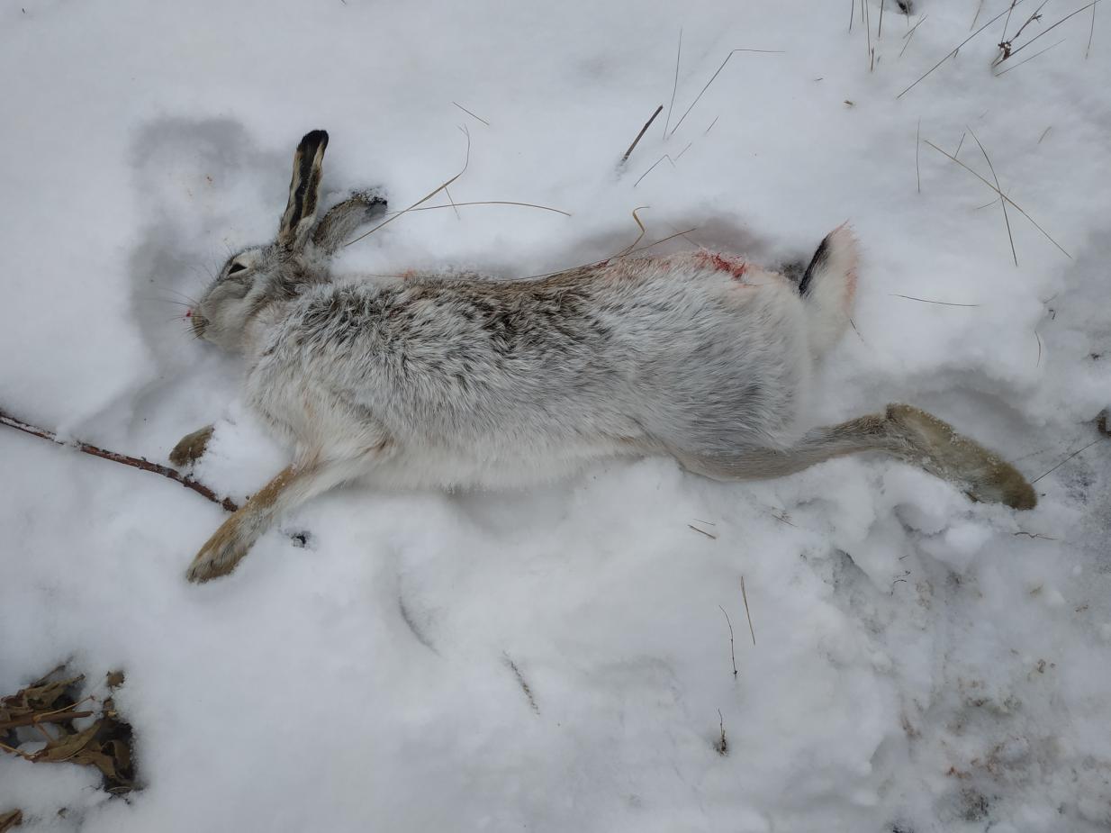 Минувшие кульбиты данного экземпляра не давали покоя. Сон нарушился и думы были всякие. Какие тактические ходы предпринять...но буду краток ибо охота была скоротечна то есть "Охота по Кольту" (по "Косому" в другой истории может быть ( выстрел был один)) и на задах деревни...все прям как он описывает.))))). Снега немного сыпануло, но недостаточно и позавчерашние следы было видно, но то что они стары, легко узнавалось. Выйдя на территорию матёрого зайца были обнаружены пару человеческих следов.."залетные охотники" прошлись утром пытались торопить зайца по кормежке, натоптали не меньше чем зайцы и ушли прочь. Я же пройдя по отвалу с которого стрелял предыдущего зайца зацепил гонный свежий след, причем было понятно что это именно он, так как шел он к себе "домой"! Видно он объегорил утренних топтунов, дал круг и восвояси...где по укатанному собаками и людьми снегу его найти нереально. Главная ошибка профессора была его самонадеянность и он лег на ветер...скидка с гонного следа, петля метров десять. Скидку я не разобрал, вернулся выхода нет, лишь старые следы лисы.Ты здесь! подумал я слегка зевнув, но где же? Ветер с права смотрю небольшой ложок крепко поросший амброзией и полыном по левую руку-нет его. Дошел до конца следа не разобрать где скидка. Поворачиваю на ветер лицом и под 90 градусов иду к другому логу метров семь подхожу на край вижу вниз идет след профессора в пучек полыни. Нервы сдали заяц вылетел метрах в пяти, вскидываюсь медлить нельзя кругом высокая полынь и разнотравье. Выстрел дробью номер #5 жахнул с глухим эхом, стая ворон закружилась над коровником, куры взлетели неподалеку, в воздухе стоял запах соснового дыма деревенских бань, день близился к концу, пятница пришла, заяц прогнулся и остался на месте даже не дернувшись.