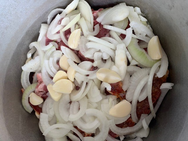 Хашлама! Решил я приготовить Хашламу (честно все руки не доходили). Как раз выдались выходные и мы с друзьями, с семьями у мангала собрались … Как оказалось рецептов Хашламы очень много, как плова или ухи например… Я выбрал простой, ленивый рецепт, просто слои уложил по своему и все…. Вообще готовить Хашламу очень просто, проще любого супа…))) Рецепт: мяса молодого кабаненка на кости (уголки, пистолетики) – 2.5 кг. Укладываем в казан, на дно, солим перчим + лавровый лист, сверху на него лук полукольцами, один стручок острого перца, помидор дольками так же слой, перец сладкий, морковь, сверху картошечку – каждый слой солим и перчим, без «особенных» специй. Сверху зелень: петрушка, укроп, кинза… Залил литром воды и 300 грамм пива (знаю, что в идеале вообще на пиве готовить, но решил как решил…). Закрываем крышкой, доводим до кипения и убавляем жар/огонь. 2 часа томилось это чудо в казанке и после открывания крышки стало одним из моих любимых блюд! Бульон – не передать словами, вкус овощей не описать, мясо – нежное, от косточки отходит, короче не могу рассказать…))), это надо пробовать! Рекомендую всем приготовить! Приятного аппетита!