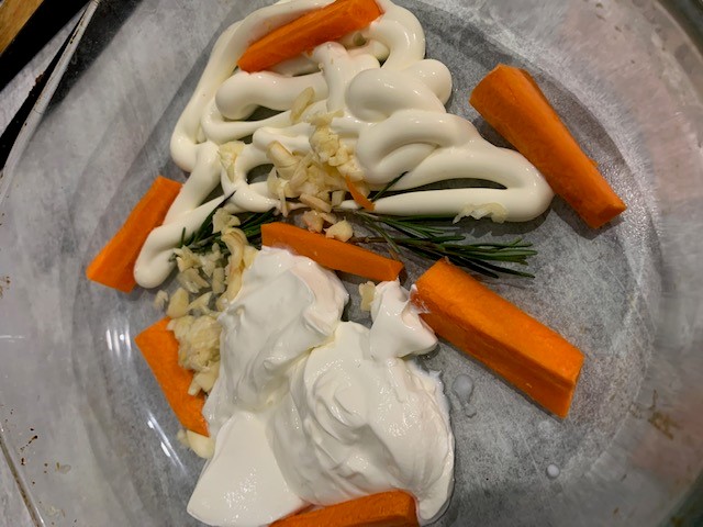 4. Далее «изюминка» блюда, как я считаю – соус в котором будем тушить зайчика: Сметана + Майонез (50/50) + чеснок. В этот раз добавил розмарин и морковку (для эксперимента).