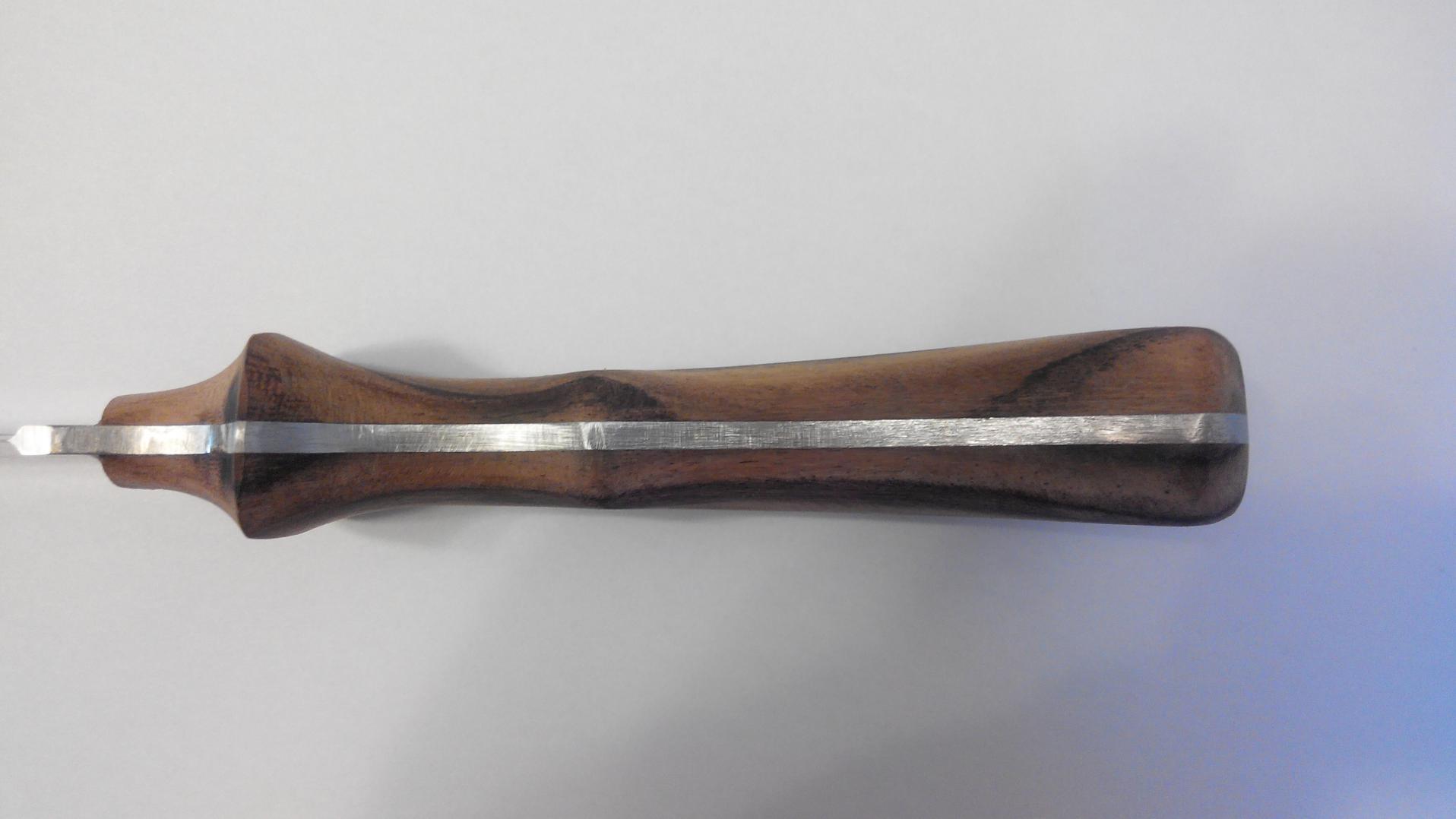 Вот схожая по конструкции рукоять ножа товарища. Но этот нож удобен при разных хватах. В том числе "нежный" потяг двумя пальцами за переднюю часть рукояти при совершении надрезов. Также рукоять рассчитана на хват за клинок, когда средний или безымянный палец лежит в подпальцевой выемке спереди упора. Для тонких работ. Ну а для силовых работ рукоять годна по определению.