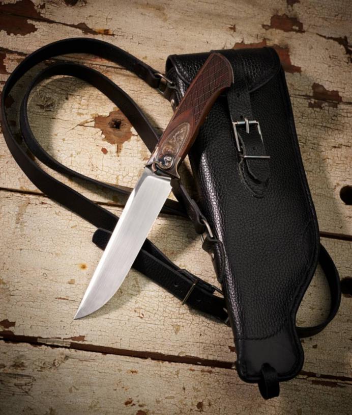 Смотреть с осторожностью! Возможно неконтролируемое семяизвержение. "Нож подружейный АРМ "Тулка" Авторы: И.Музалёв (Danok) К.Чернов (ЧК) Захаров.Д(ZD) Клинок;М-390,150мм,32мм, 4мм. Рукоять;Орех, белый метал, длина 120мм, гравировка. Ножны; кожа, белый металл, мех, липа.."