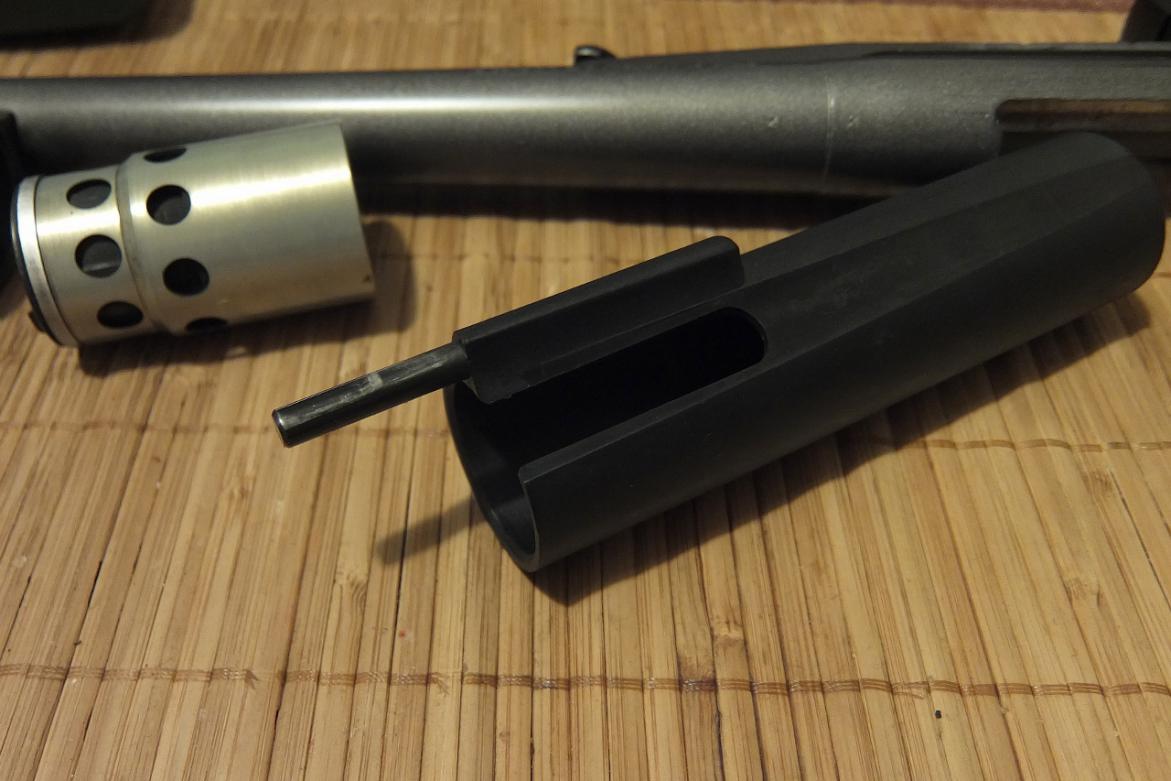 место на трубке магазине в районе которого движется газовый поршень, усиленно. заметно утолщение на пару миллиметров на трубке магазина. связано это с тем, что на ранних моделях ещё браунингов, при большом настреле в данном месте трубка имела место выгорать на сквозь с течением времени. здесь времени понадобится существенно больше...
