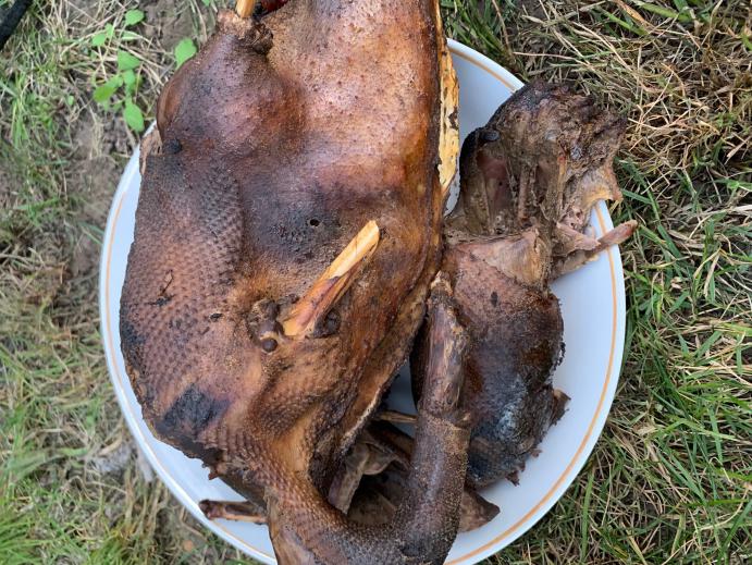 2. Если нет мангала, то можно выкопать яму по размеру в два раза больше, чем утка. Дно ямы застелить фольгой и засыпать туда часть углей. Сверху поместить утку в фольге и засыпать оставшимися углями, чтобы полностью покрыть утку. Через 1,5 часа утку можно доставать, но можно готовить и дольше - мясо получится ещё нежнее.