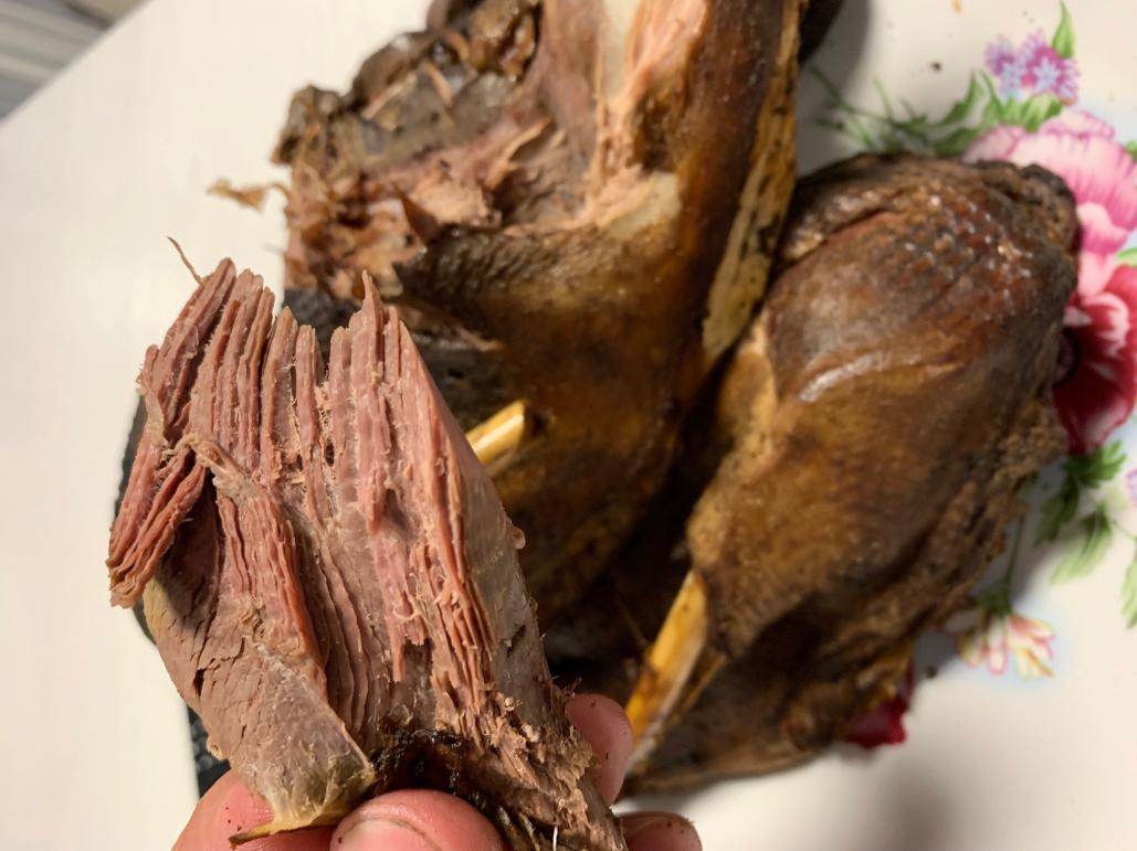 Гуся порезал пополам, селезни целиком – уложил в казан, приправил перцем, кориандром, лаврушкой, паприкой и обильно посолил (это очень важно, так в идеале мариновать в рассоле, что б мясо просолилось). Далее доводи до кипения и варим 20 минут, далее секрет – остывать оставляем в этом рассоле до полного остывания. Ну, а дальше все просто – опилки замочить на часок, на дно коптилки их, решетки ставим и каждый кусок гуся и целых селезней обворачиваем марлей в два слоя. Коптим на медленном огне 40 минут. Мясо получается нежным, сочным и очень вкусным. Дети и жена уплетали за обе щеки…))