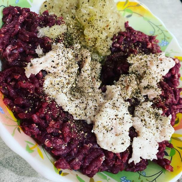 Фарш – заяц + свиное сало + лук (пропорции на фото). Солим и перчим по вкусу.