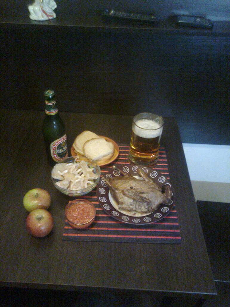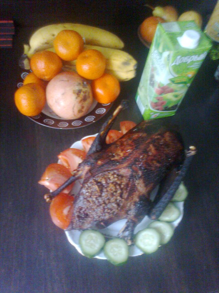 А вот и гусик фаршированный гречкой и собственными потрашками. Только забыл крылышки в фольгу замотать
