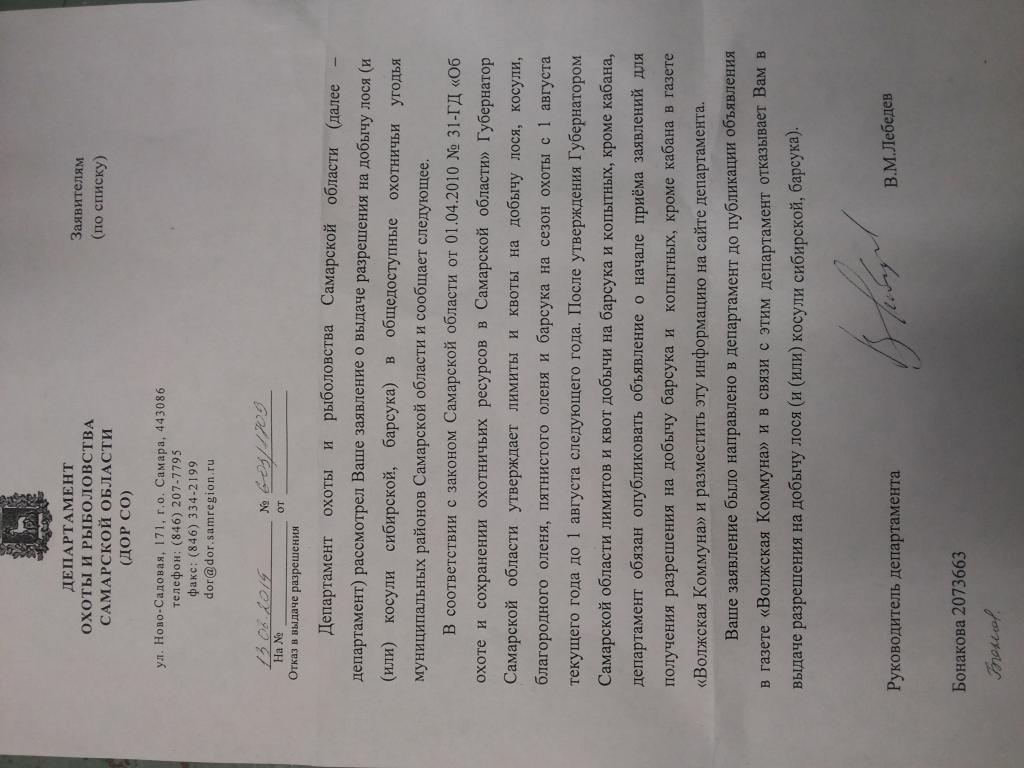 Добрый всем день. Если кому интересно и кто не в курсе как выглядит "мотивированный отказ" на добычу копытных, поделюсь: