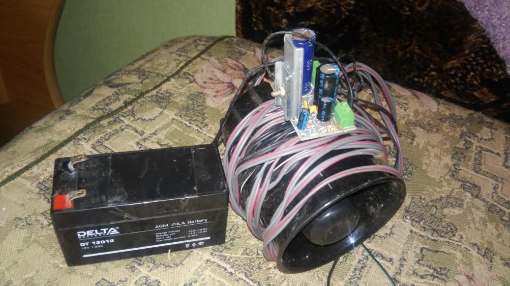 Состоит из рупора сигнализации, платы для усиления звука, акк-ра и проводов. Нужно только подключить его к МР-3 плееру или смартфону/телефону.