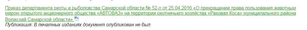 Приказ Департамента ОиР Самарской области 52-п от25.04.2016 года "О прекращении права пользования Автоваз участком Раковая коса. Есть на сайте Депа в разделе документы - ведомственные: http://www.dor.samregion.ru/law/departmental/