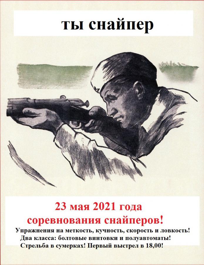 23 мая 2021 года ПРОВОДИМ соревнования снайперов. Два класса: болтовые винтовки и полуавтоматы. Дистанции до 600 метров. Упражнения на меткость, кучность, скорость и ловкость. Стрельба в сумерках! Начало регистрации в 17,00. Первый выстрел в 18,00. Разрешены любые прицелы и дальномеры! Наличие ремня для переноса винтовки ОБЯЗАТЕЛЬНО! Регламент соревнований и брифинги будут размещены позднее!