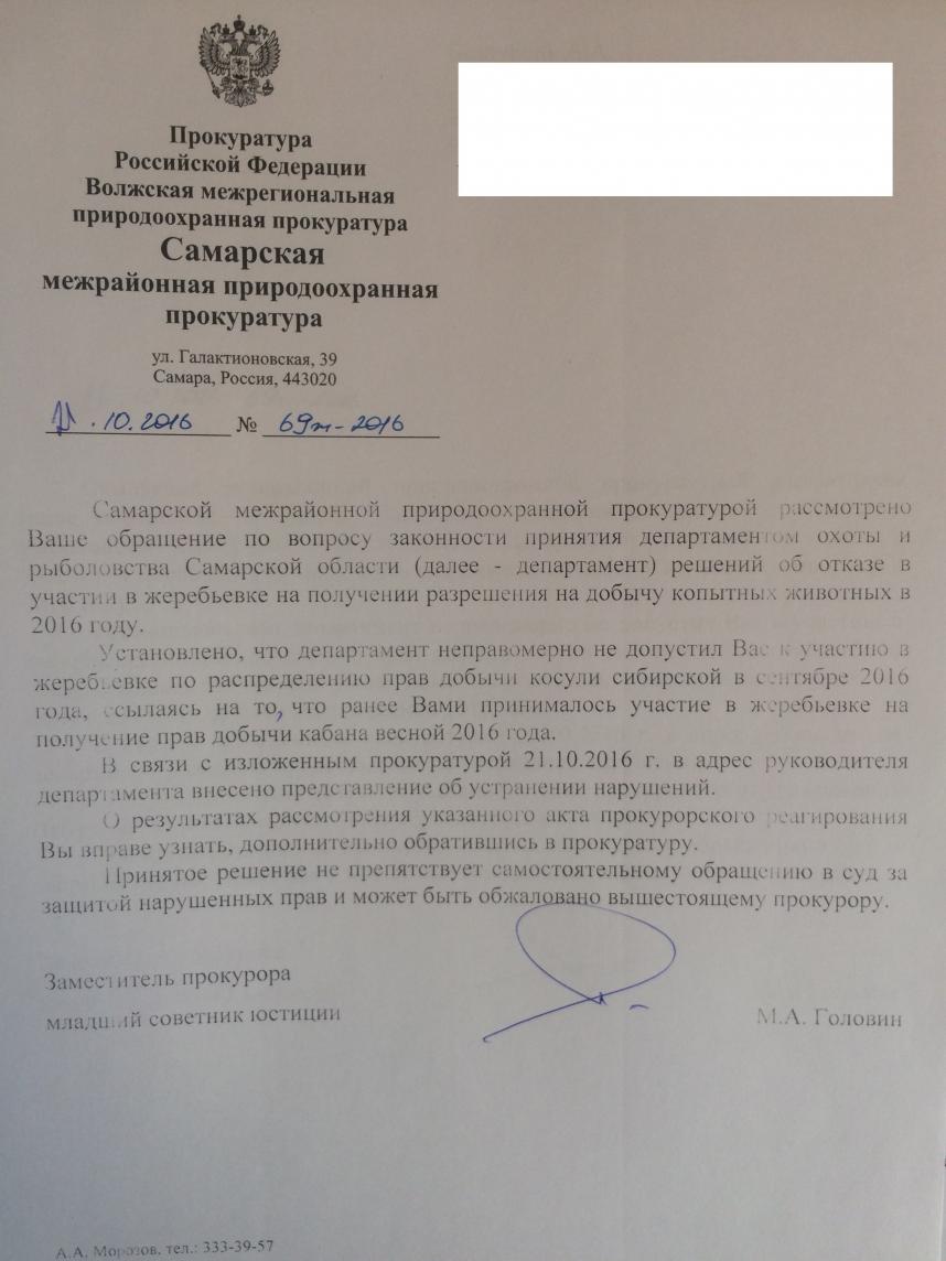 ![]() Природоохранная прокуратура посчитала, что были нарушены права и незаконно было отказано в жеребьевке. То есть все имеют полное право участвовать в Самарской области по 5 видам жеребьевок, кроме победителей. Вынесено представление об устранении нарушений, через месяц напишу узнаю как департамент исполняет представления прокурора 2:0 в мою пользу: первая барсук, вторая жеребьевка, и как работают не понимаю!!!