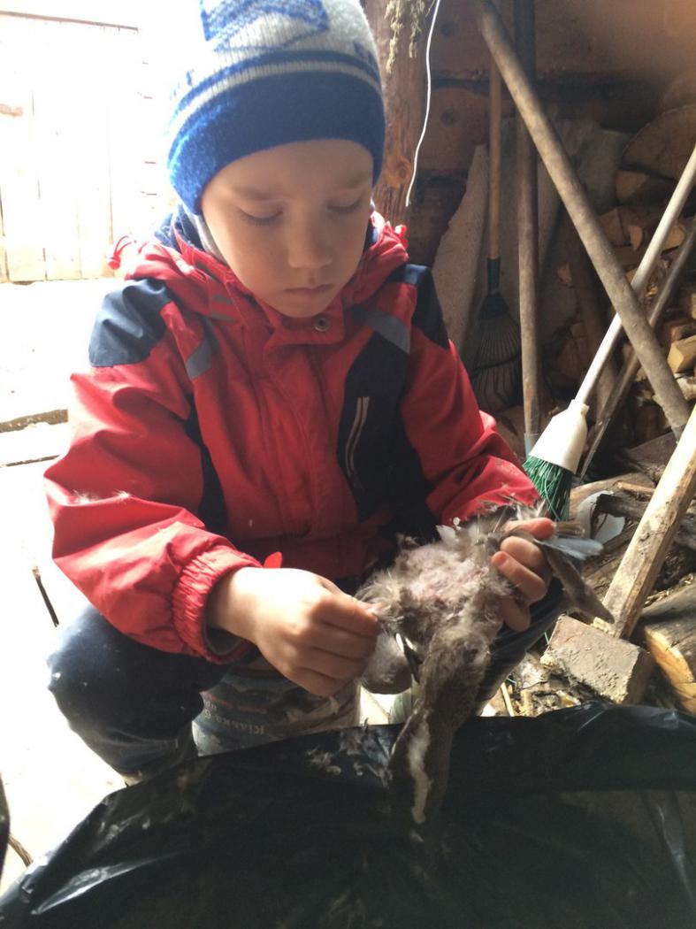 Сосредоточен).Двух чирков ощипал ,сам причем вызвался, не заставлял. Лапок полные карманы домой привез) . Сушит их и классифицирует...)