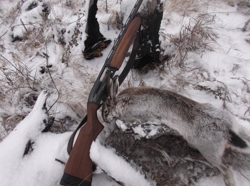 На охоте был сегодня всего полчаса. Съезжаю в угодья и вижу , на встречу мне едет машина. В ней охотник. Остановились, побалтали немного. Я спросил есть ли следочки с ночи. Он ответил ,что не видел, что заяц похоже в снегопад не вставал и что они охотятся группой и с собаками. Ну думаю мешать не буду, а полазию немного по кустам около дороги. Прочесал куровник-безрезультатно. Пошёл вдоль небольшого овражка и метров через 200 нахожу присыпанные следы. Настроение сразу пошло вверх.Хоть и следы присыпаны , но это сто пудов с вчерашнего вечера.Вывел меня след в скошенный подсолнечник. Покружил я там минут 5 и вижу зайца метрах в 40 убегающего прочь от меня. Четыре выстрела получились как очередь. А заяц бежит. Ну думаю опять промах, но как положенно пошёл по гонному следу. И вот удача где легла дробь от 1 выстрела лежит клочок шерсти. Значит зацепил.В погоню. Метров через 70-80 капелька крови и чем дальше тем больше кровит. Ништяк , увеличиваю темп ходьбы. И метров через 100 заяц опять поднимается ( залёг оказалось) и бежит от меня метрах в 50 с права на лево. Один выстрел с упреждением и заяц делает кувырок. Ура добыт. При разделке оказалось , что первым выстрелом я ему попал в основание хвоста( копчик), вот он не смог далеко уйти. Патроны азот NRC №1 навеска 36 грамм.
