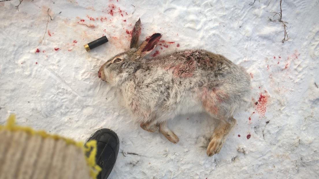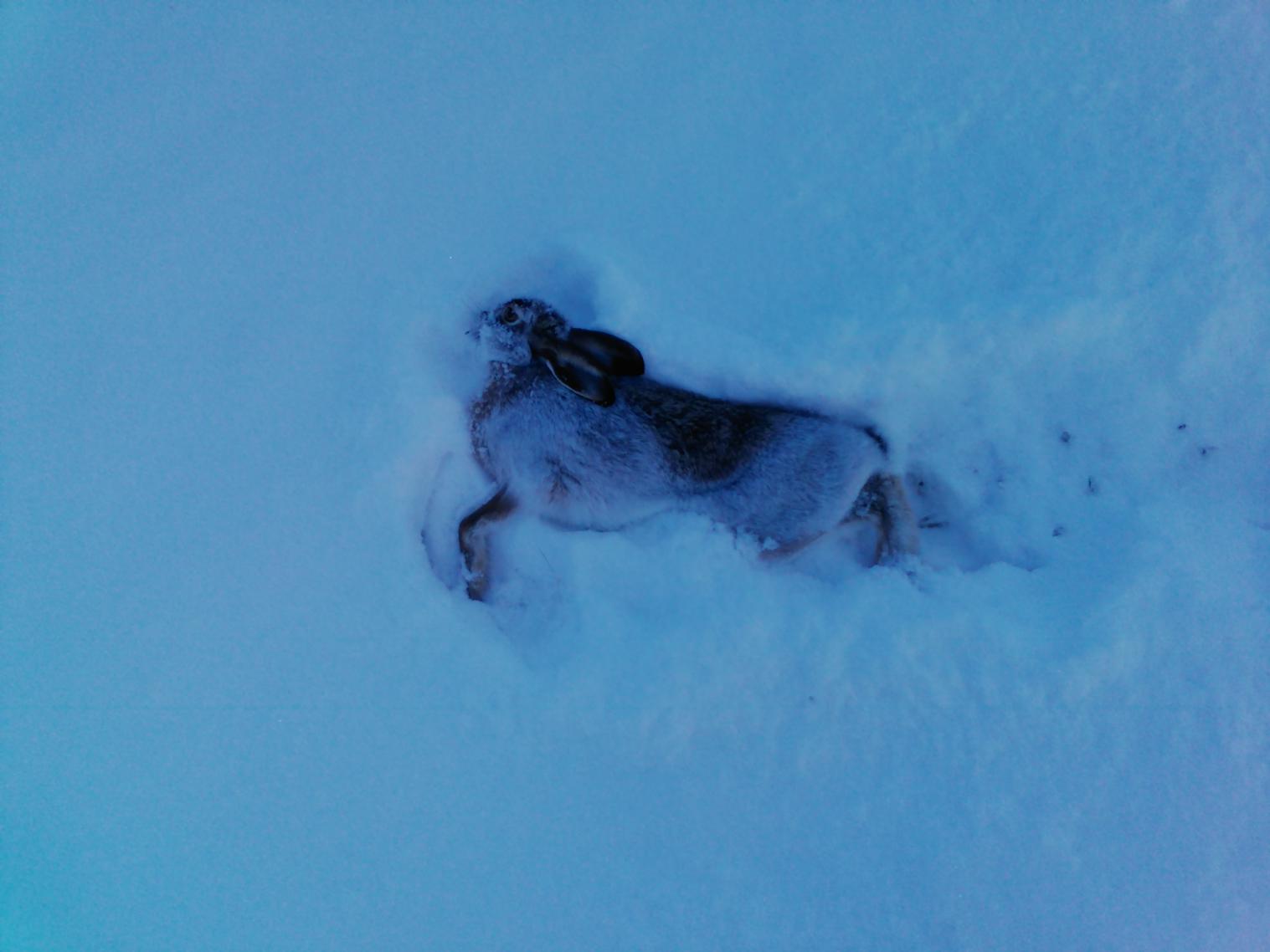 Разделились с друзьями т.к в том месте,в которое мы добрались была возможность хоть и намучившись, но все-таки отличить старые следы от новых. Идя с братом обнаружили ночной след-лапка не большая, заяц должен быть не крупный и молодой. Брат подошел по следу к островку высокой челиги, я прикрывал отход . Ржал я потом - братан, вместо того чтоб обойти ее или тихо пройти, взял и ломанулся через кусты бегом , я думал зайца догоняет,а это ему просто скучно стало. Впереди братана с глазами на выкате мчал заяС явно оху....вая от происходящего!!! Пришлось мне его успокоить, второй выстрел - второй зай: