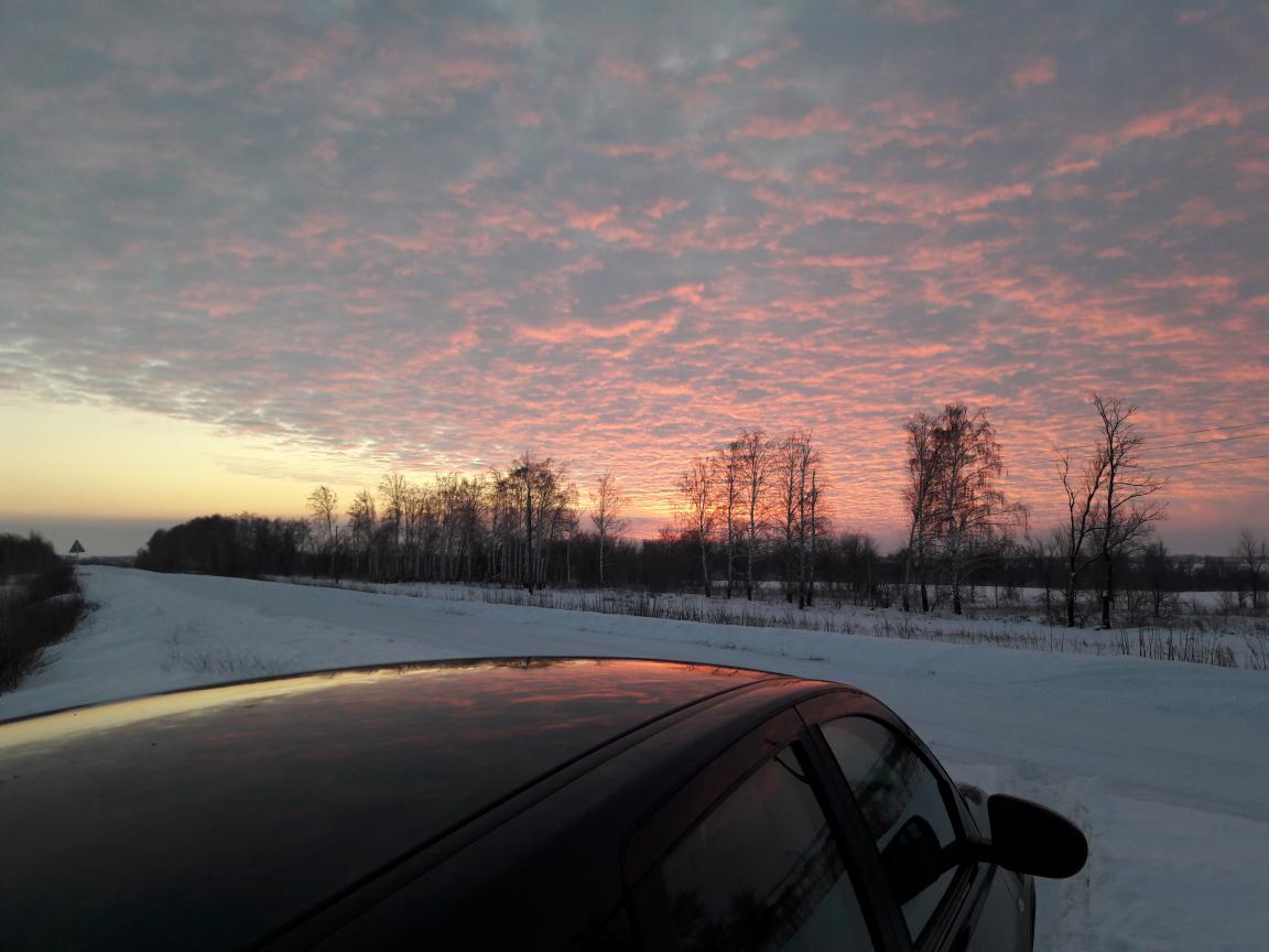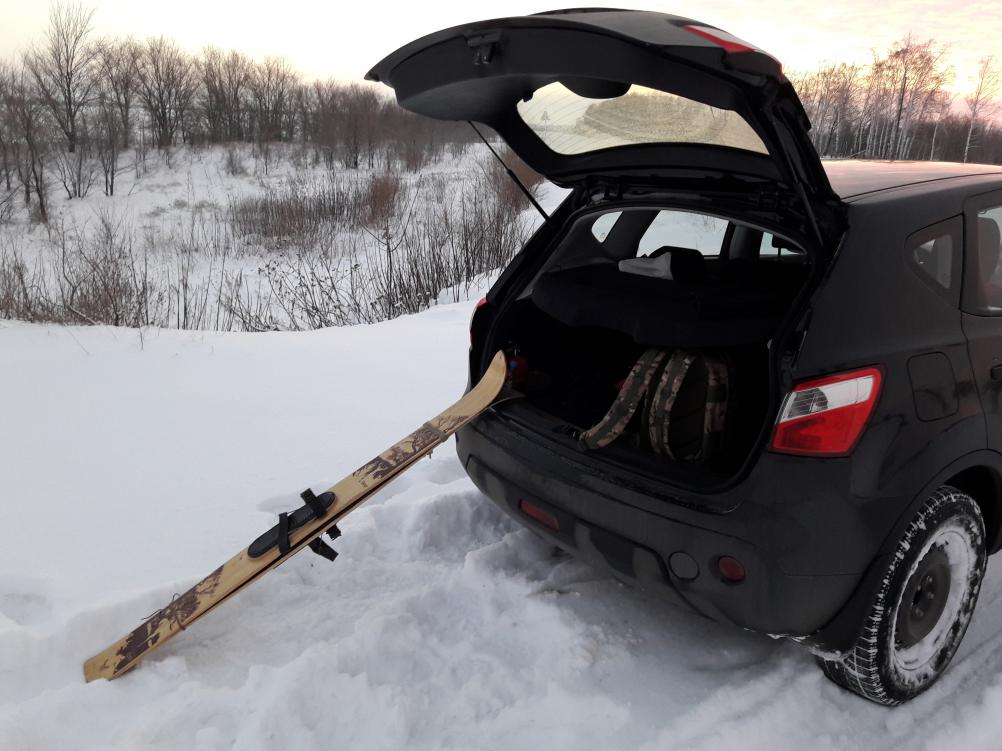 В 6 утра выехал один, в ожидании в угодиях толп охотников. Но по дороге увидел только компанию из пары машин и их пассажиров, пьющих чай на капоте. Мне дальше, туда, где зайцы толще! Прибыл четко к рассвету, выставил "согреться" лыжи, нарядился. Попив чайку, решил пройтись пока без лыж. Но через 300 метров сознание ко мне вернулось , и тихо матерясь и спотыукаясь в сугробах и легком насте, побрел к машине.