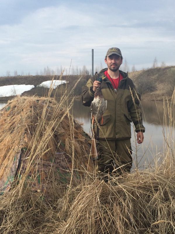 Воскресенье утро. Дождь не прекращался, прибавился ветер. В 4 подъем, по темну обустроились на местах. Короче, было пролетов штуки 3 по 2-6 уток в стае и все далеко. Подманить удалось всего лишь двух и то те покружив в стороне свалили от нас. Тут мы сидим и из-за дерева пикирует селезень и садиться между нами на берег. Я думал он к чучелу Димы присядет, но тот пропархал до берега. Я конечно запереживал за выстрел напротив. Дима пока выскакивал из скрадка на выстрел не в мою сторону, тот поднялся. Щас вот думаю, может надо было сидеть тихо и ждать, когда он на воду к чучелу пойдет? Не поторопились мы? Все это утро, начиная с темноты, за спиной крякала утка. Не летала или летала очень низко. За мной пригорок был, не видел ее ни разу, но она то чуть левее крякает, то правее. Звала селезня походу, но так и не дозвалась. Как и мы в принципе.