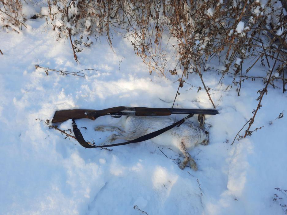 Всё таки я добрал позавчерашнего подранка. И поднялся он в 100 метрах от прошлого раза. Опять метров на 7-8 подпустил, но убегал прикрываясь кустообразным карагачём. Но ихняя косоглазая анатомия уводит зайцев с прямой в сторону. И вот заяц начал забирать в лево и показался в прицеле. А я уже был на 100 % готов. Метров 30-35 и одним выстрелом заяц добыт. Начал кувыркаться и крутится , но я уже учёный такими выкрутасами, стою и держу его на прицеле. Ну вроде всё успокоился , можно забирать. Стал его разглядывать , одно попадание в ляжку и одно в затылок. А правое ухо всё в запечёной крови, по этому то я и думаю , что это мой знакомый. На душе даже полегчало. А на охоте я был всего то 15 минут. Положил зайца в багажник и прогулялся просто так, что бы на будущее лыжню проложить киломатров на 5-6.