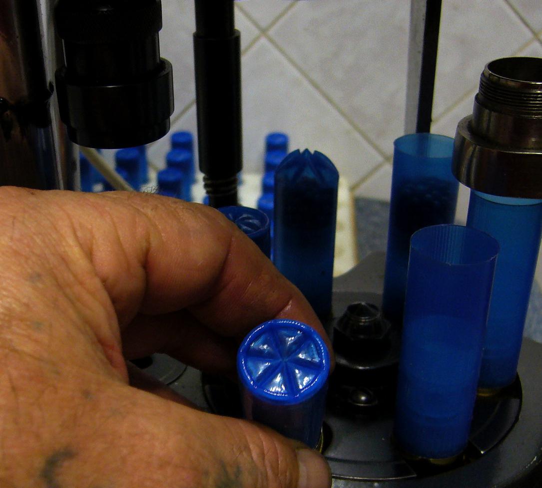 Порох Рекс2 1,63г. Дозировался на дозаторе Реддинг. Сборку патрона пришлось производить в два этапа. И связано это, с прослабленными Биороми, обтюраторы которых пришлось раздавливать, для плотного вхождения в гильзу. Дозирование дроби и закрытие в три этапа нарезка (звезда), подрубка, стяжка (подкрутка), проводилось на прессе Пацифик 300(М). |