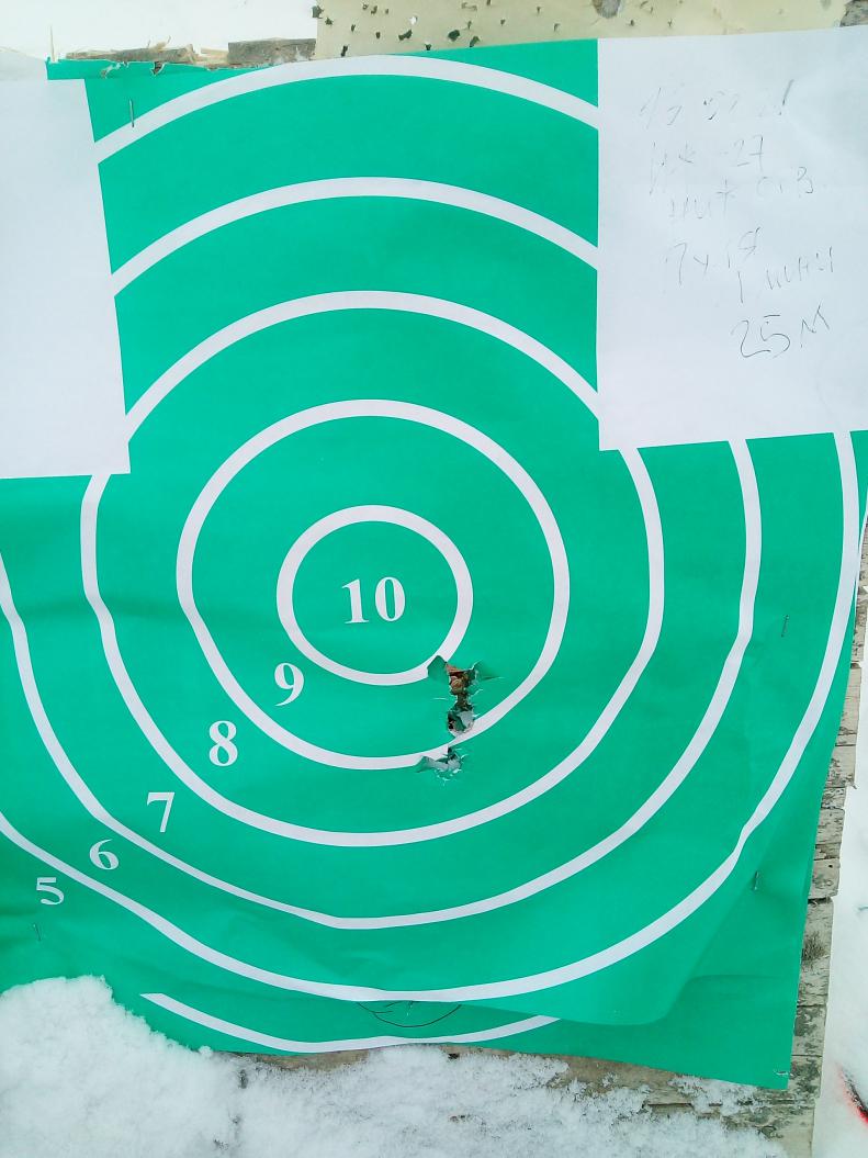 16 февраля 2020 на Вымпеле провёл контрольный отстрел самоснаряжённых патронов с пулей Люман мини. Вес пули с пыж-контейнером (Н-28) и опилками в юбке - 28 гр. Порох Сокол 2 гр. Закрутка. Ружьё ИЖ 27. Дистанция 25 метров. Патроны специально держал два часа на морозе. Вывод: 2 грамма пороха в зиму мало. Попробую сделать 2,2. На фото лучшая куча. С нижнего ствола.
