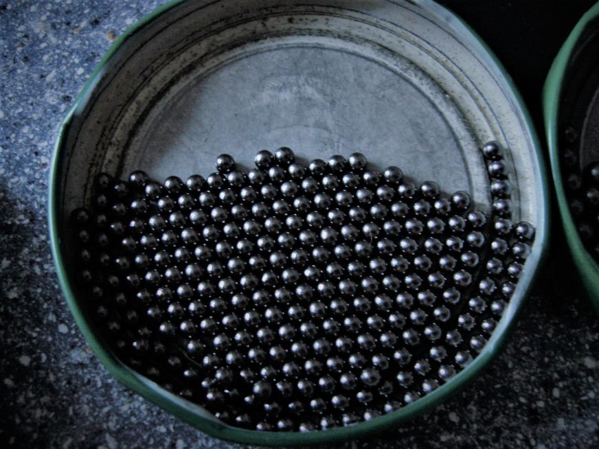 Микс готовил (готовлю) из кабельного свинца, плюс аком., в определенном соотношении. Затем данный микс отливается в заготовки ( в виде прутка), которые в последствии проходят калибровку по диаметру, под нужный размер дроби, через протяжки (фильеры). Затем производим нарезку прутков на резаке (дроборезка), таким образом, что бы диаметр цилиндрика, был равен его высоте. Это важно. О конструкции резака уточнять не буду, работает он по принципу мясорубки , и имеет как ручной, так и эл. привод. Так что сырье готово... Некоторые такое сырье катают на "сковородке", как Вячеслав222, кто то с приводами... Одним словом придают сырью форму шара. Лет 35-ть тому назад, оттолкнулся от катания на "сковородке" и изготовил граненый (шестигранный) барабан. Стенки барабана имеют определенное количество отверстий 2мм в диам. Это для сброса свинцовой пыли, которая ухудшает процесс формирования шара. При вращении, в граненом барабане, в отличии от различных "сковородочных" видов прокатки, сырье не обкатывается, а оббивается точечно, об внутренние стенки. За счет этого и происходит ровное формирование шара. Засыпаем сарье в барабан, закрываем резьбовую крышку, ставим на привод, включаем, процесс пошел...)) По истечении определенного времени, изымаем готовый (матовый) полуфабрикат. Затем "обдирка" в сетчатом (цилиндрическом) барабане... Затем зеркалка (графитирование) в цилиндрическом барабане... Все..)) Если конечно сырье было разноразмерное, то по финишу необходимо за счет сит, рассортировать по номерам... |