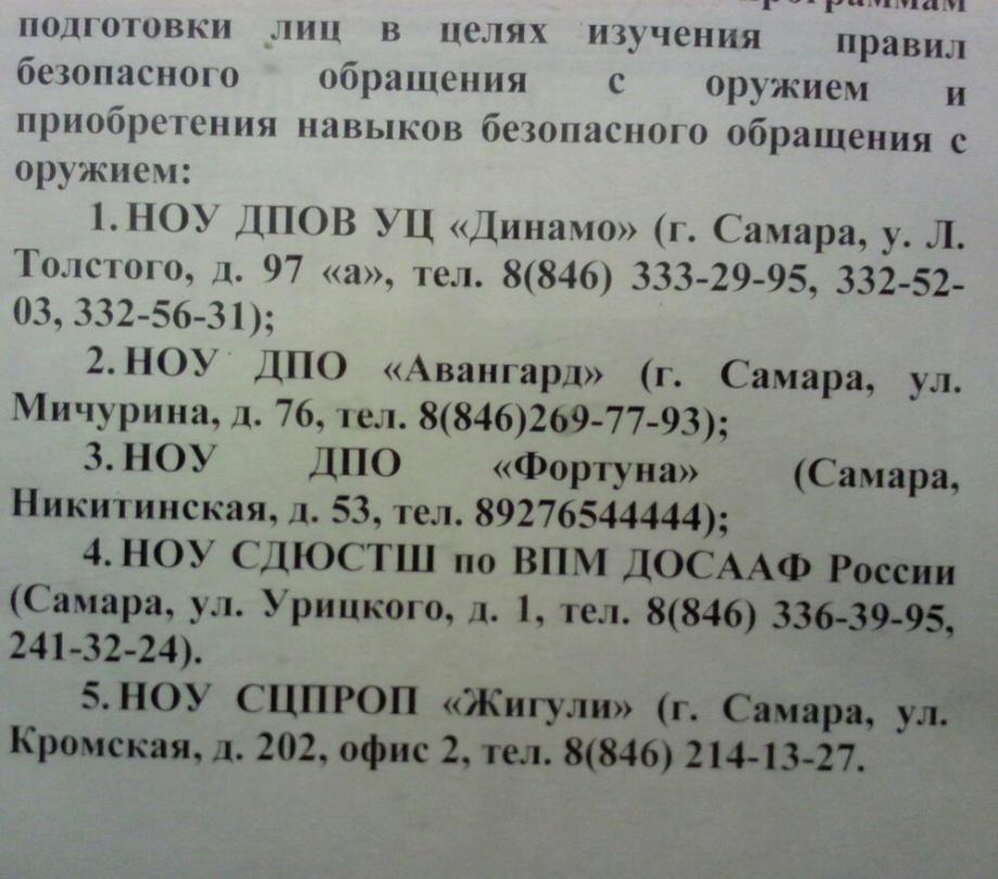 Вот адреса в Самаре,кому надо!На Динамо лучше не соваться....Хоть там на 1000 дешевле обещаютвсего 2500 .На зачётах вытянут за 5000!!!Пересдача 1100. Процент сдачи приблизительно 20-30%.Проваливают-огневую,причём и со второго раза не сдают. Теория на компе.Там..своеобразный инструктор по огневой!