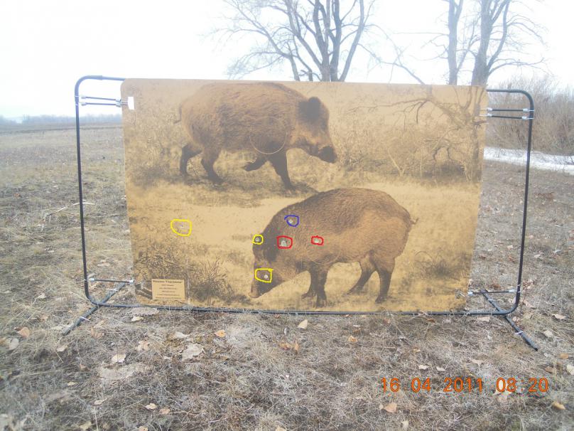 Красным помечены пробоины от Полевы, синим от Совестра, желтыми от самоделки. Стрелял с расстояния 60 шагов. Попадания Полевой точно по месту прицеливания, Совестром примерно на 10 см выше, самодельной сами видите, а целился в основание головы, куда легла вторая Полева... |