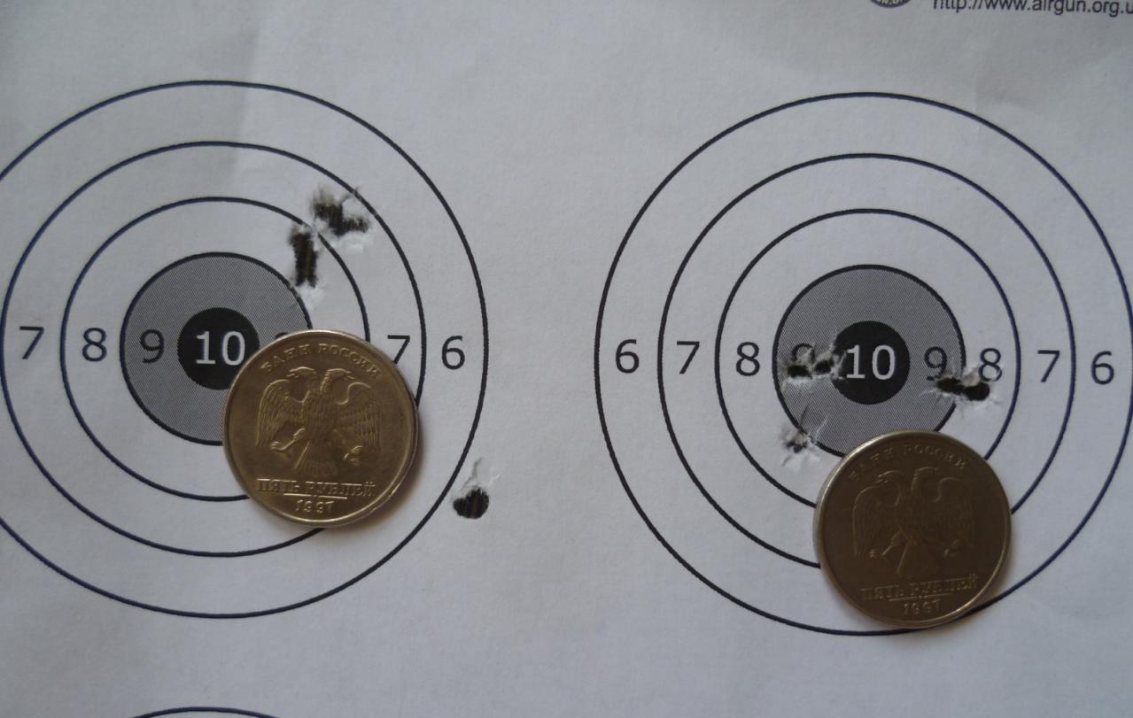 На втором фото где пули легли немного кучнее отстрел производил просто с упора без фиксации.Монета 5р.