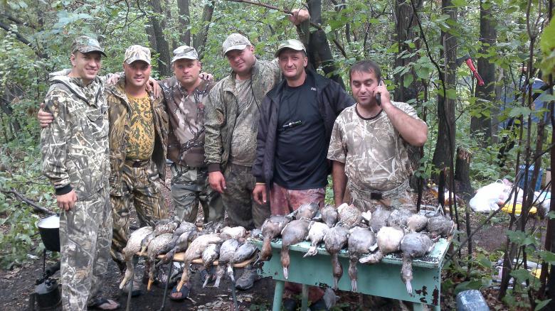 В этом году было решено открываться на Волге, и вот в пятницу вечером всем своим коллективом из 8 человек выехали на моторках на острова, в семь часов вечера поехали выкинули в трех разных местах чучела при этом подняв несметное количество утки разных видов, по приезду на берег выпили по 50 грамм и съели последнего весеннего гуся, нетерпеливые м...ки уже с вечера начали стрелять, и вот звонит будильник 3:00, протираем глаза выходим из палаток а на улице ливень, половина нашей команды сразу изъявили желание поспать, но не тут то было всех удачно погрузили в лодку и проехав пол пути были приятно удивлины тем что кончался дождь. Нас двоих высаживают в резиновую лодку с мотором,сами на двух лодках уходят в другой залив и мы едем по кувшинкам через минуту начинается кананада и одновременно паника, что до нашего места еще 500 метров, винт забился водорослями и на веслах лодка тоже ехать не хочет, я вижу над головой утку, бросаю быстро весла, вскидываюсь и она падая, почти попадает к нам в корму, и тут чудесным образом мотор поехал и через минуту лодка была уже в камыше, мотоутка на воде вместе с чучелами. и понеслось утки разных пород Чернеть, Красноголовый нырок, Чирок, Кряква, Серая утка, лысухи, тоже попадались правда специально их никто не стрелял. В 7 утра все резко прекратилось, вдвоем мы собрали 11 уток и одного бекаса. Приехали ребята у них тоже было с добычей все нормально, на толпу взяли 30 штук за утрянку. Дальше по рюмке и щипать потом сон и опять на охоту. За вечер взяли еще 18 штук. А на следующее утро уже ни кто ехать не хотел, у кого болело плечо, у кого голова, а у кого просто кончились патроны.