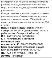 (Государственная пошлина за предоставление разрешения на добычу охотничьих ресурсов животного мира составляет 650 рублей, за выдачу дубликата указанного разрешения 350 рублей) Наименование получателя: УФК по Самарской области (департамент охоты и рыболовства Самарской области) ИНН получателя: 6316130631 КПП получателя: 631601001 Расчетный счет получателя: 40101810200000010001 Банк получателя: Отделение Самара БИК банка получателя: 043601001 КБК 048 1 08 07240 01 1000 110 ОКТМО 36701000